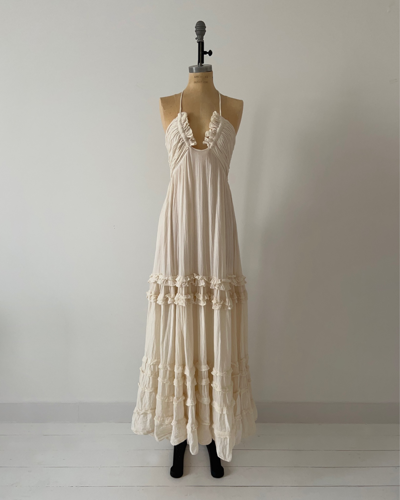 100% хлопок идеального цвета поджаристого безе, с рюшами, большим бантом сзади и завязками, которые можно адаптировать под свой вкус.